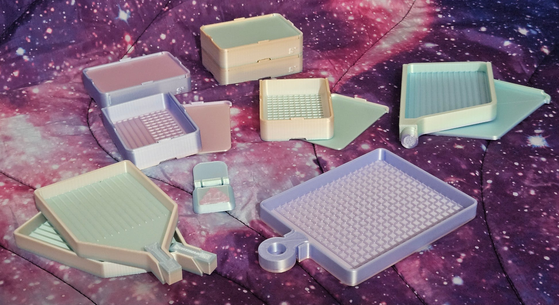 This pre-printed, ready to ship bundle of 3D printed diamond painting accessories includes: