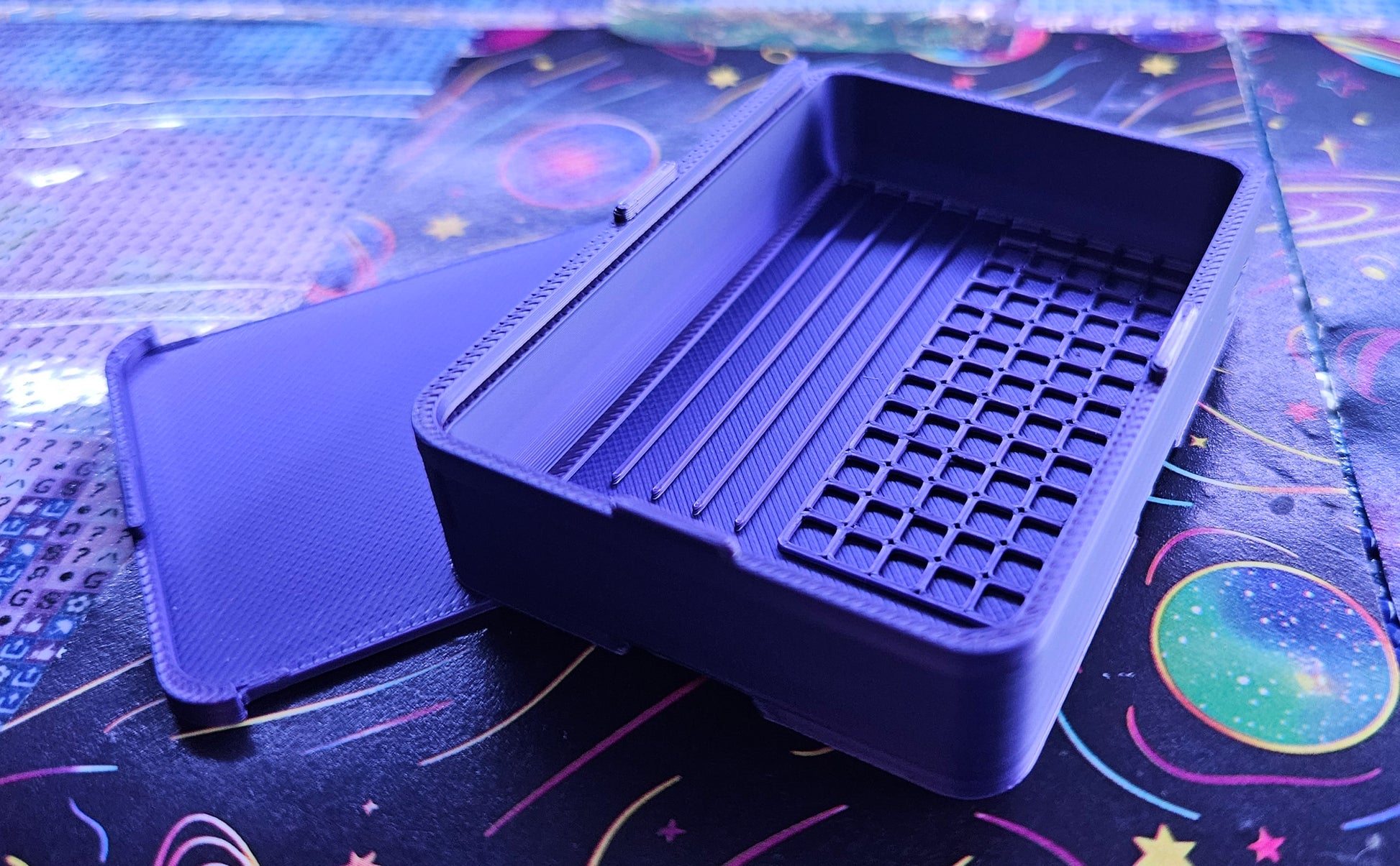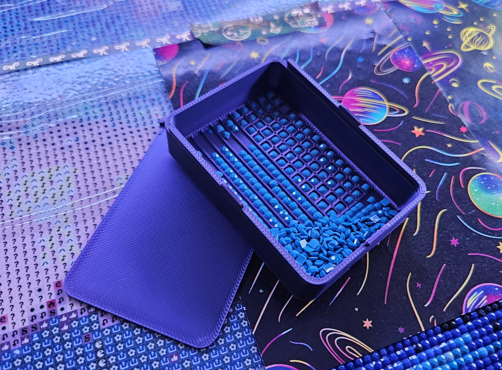 Simplify your diamond painting with our Small Spout-less Diamond Art Tray! This 3D printed tray features a dual working surface — one side has a single placer grid for perfect individual drills, and the other has traditional lines for normal multi-placing. Designed without a spout to minimize spills, it includes a smooth sliding lid for secure storage and interlocking notches easy stacking. Compact, efficient, and ideal for detailed projects! This STAR Series tray will be stacking compatible in different configurations with our other STAR Series trays. ✨ Features: * Spout-less design for fewer spills * Sliding lid to keep drills safe * Dual surface: single placer grid + standard lines * Lightweight 3D printed material * Stack-able for neat craft rooms