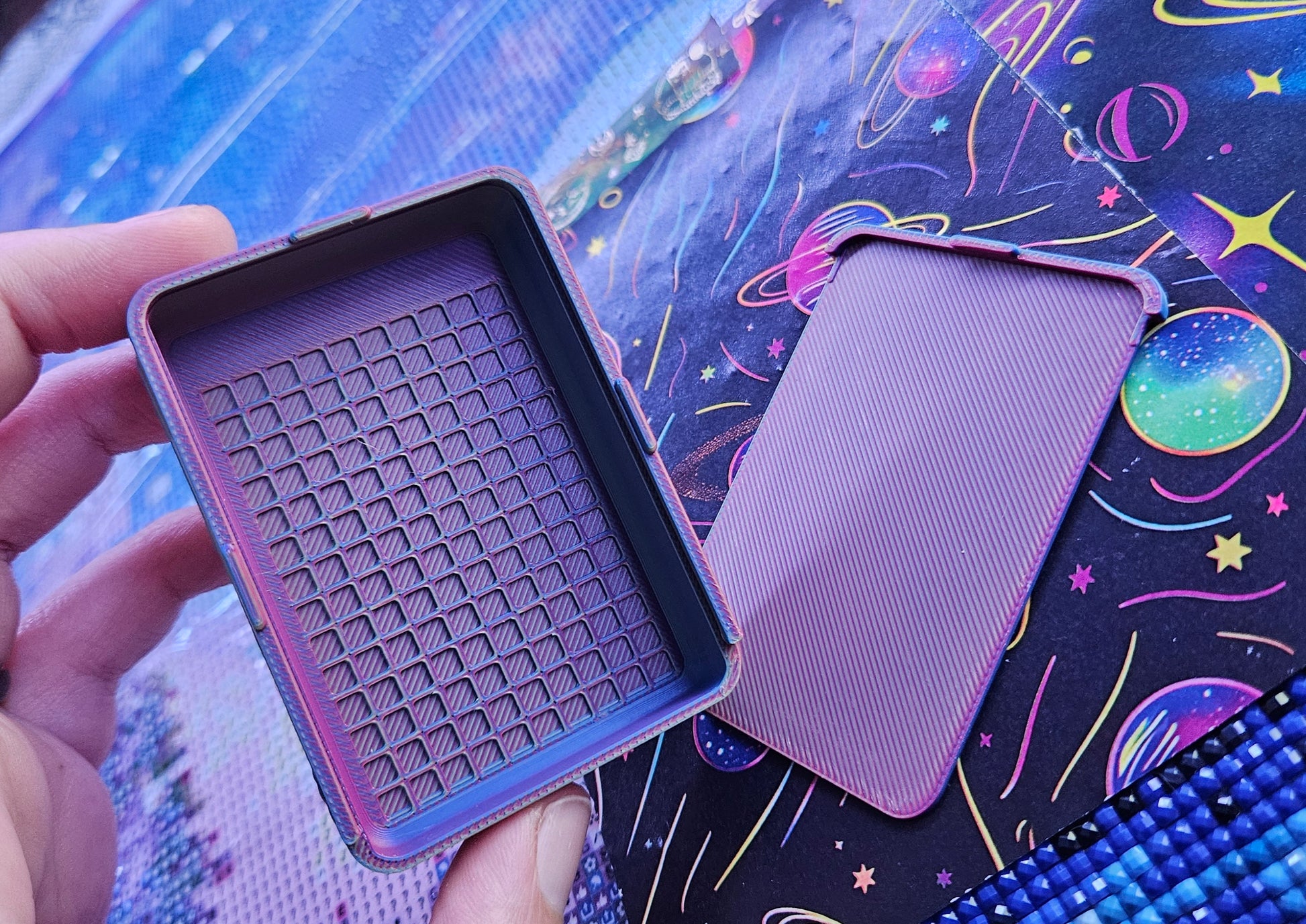 Master the art of precision with our Small Single Placer Diamond Painting Tray! This 3D printed, spout-less tray features an exclusive single placer grid, perfect for carefully placing individual drills with total control. A smooth sliding lid keeps your drills secure when not in use, and the compact, spout-less design helps prevent spills — making it ideal for focused work sessions, tight work-spaces, or travel crafting. This STAR Series tray will be stacking compatible in different configurations with our other STAR Series trays. ✨ Features: * Spout-less tray for cleaner workspace * Sliding lid for secure storage * Full single placer grid for precision * Lightweight, stack-able 3D printed design * Easy to clean and portable