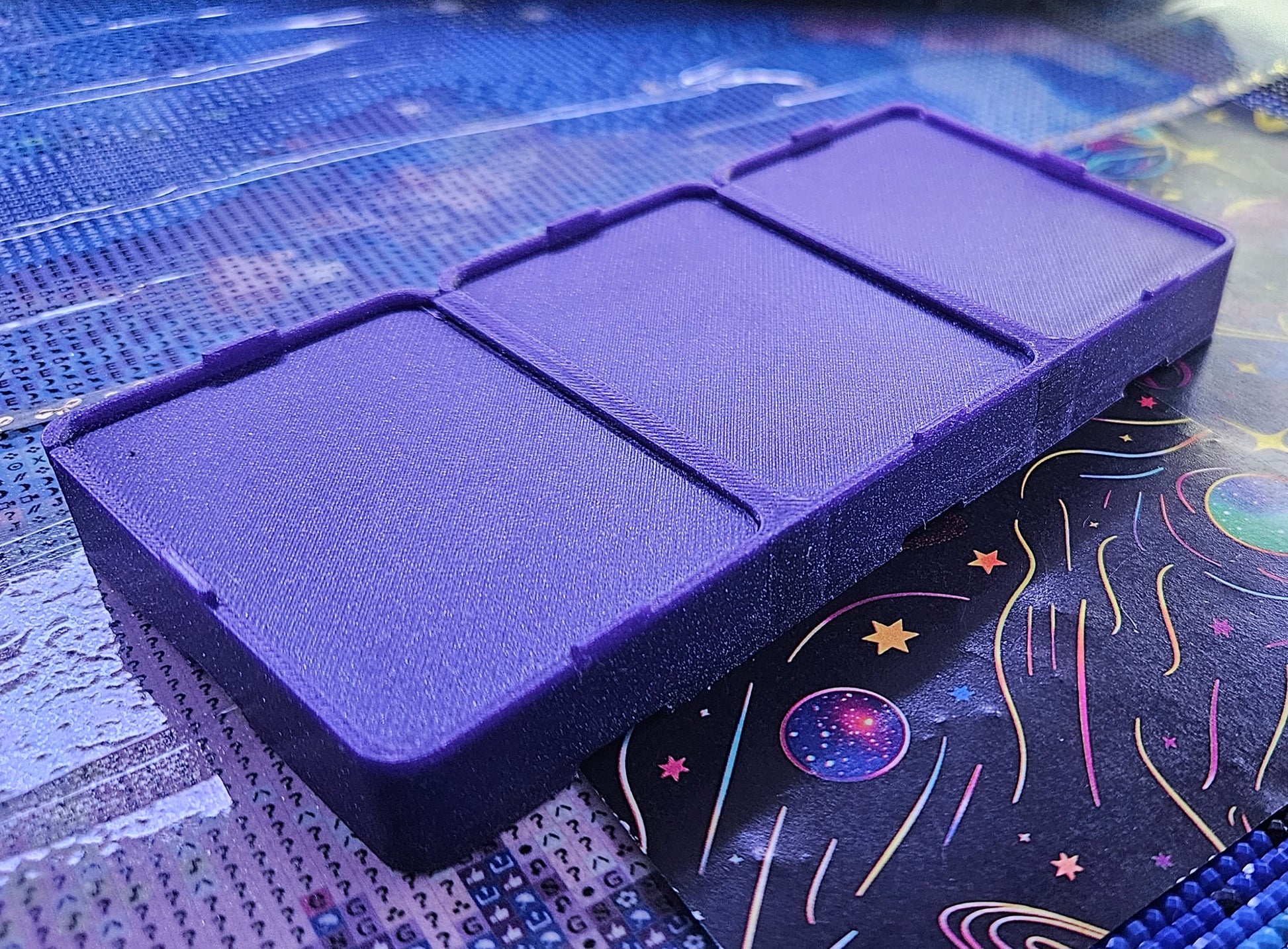 Maximize your diamond painting flow with our Triple Diamond Painting Tray! Designed with three small, spout-less trays in one unit, each tray has its own individual sliding lid for easy access and clean storage. 3D printed for durability and a stack-able design to keep your crafting space neat — perfect for big projects or multi-color sections! This STAR Series tray will be stacking compatible in different configurations with our other STAR Series trays. ✨ Features: * Three small trays connected side-by-side * Individual sliding lids for each tray * Standard drill lines in every tray * Spout-less design for clean crafting * Lightweight and stack-able
